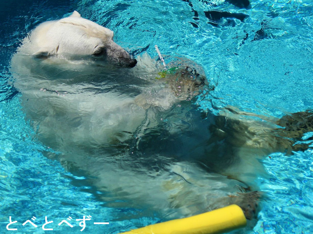 夏になり、屋外プールに水が張られました。この日は、とべ動物園のイベント「ホッキョクグマのピースへアジのプレゼント」があり、昼過ぎからピースが屋外に出て来ました。