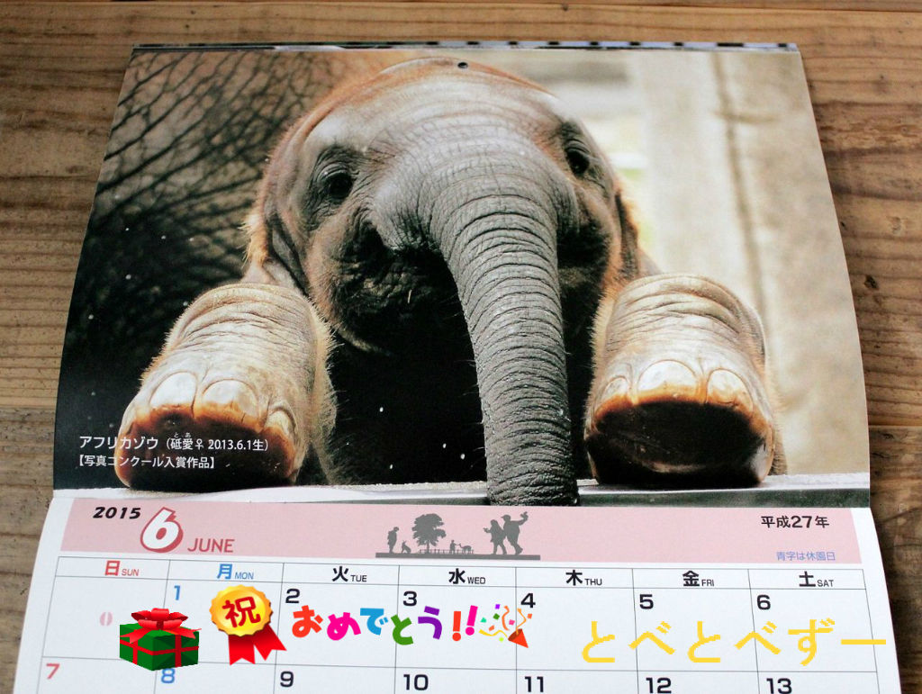 しか~も!砥愛ちゃんの写真は、ケが今年の「とべ動物園写真コンクール」に応募した写真が採用されているじゃないですか!!! とべ動物園のカレンダーには毎月違う動物が採用されているので、ゾウさんの写真は砥愛ちゃんだけ