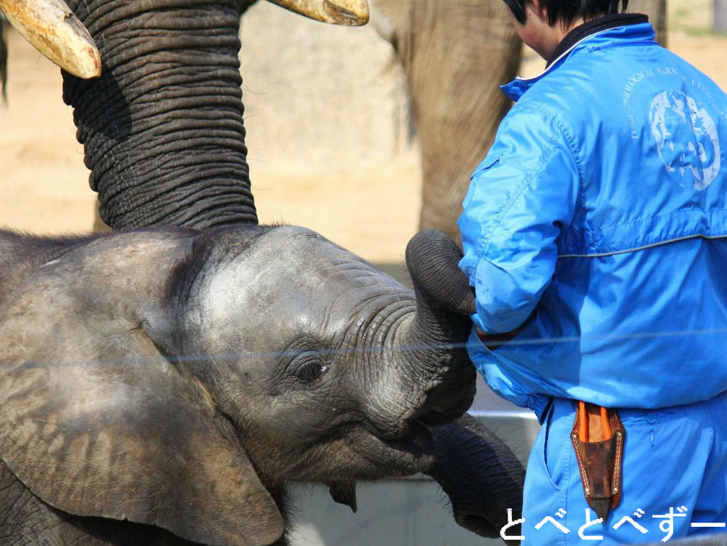 寒い冬の間、砥愛ちゃんの体調管理もあったのか、室内飼育場と運動場の間の柵は開いており、とべ家の女性陣は自由に室内展示場に出入りしていました。ようやく暖かくなり、砥愛ちゃんもスクスクと成長しているので、最近はこの柵は閉まっています。営業時間中はたっぷりと大勢のとべ家のファンに見て頂こうとの営業方針のようです。