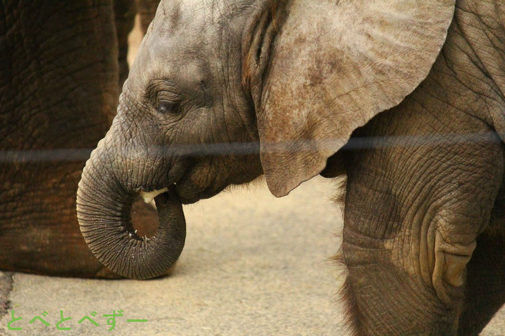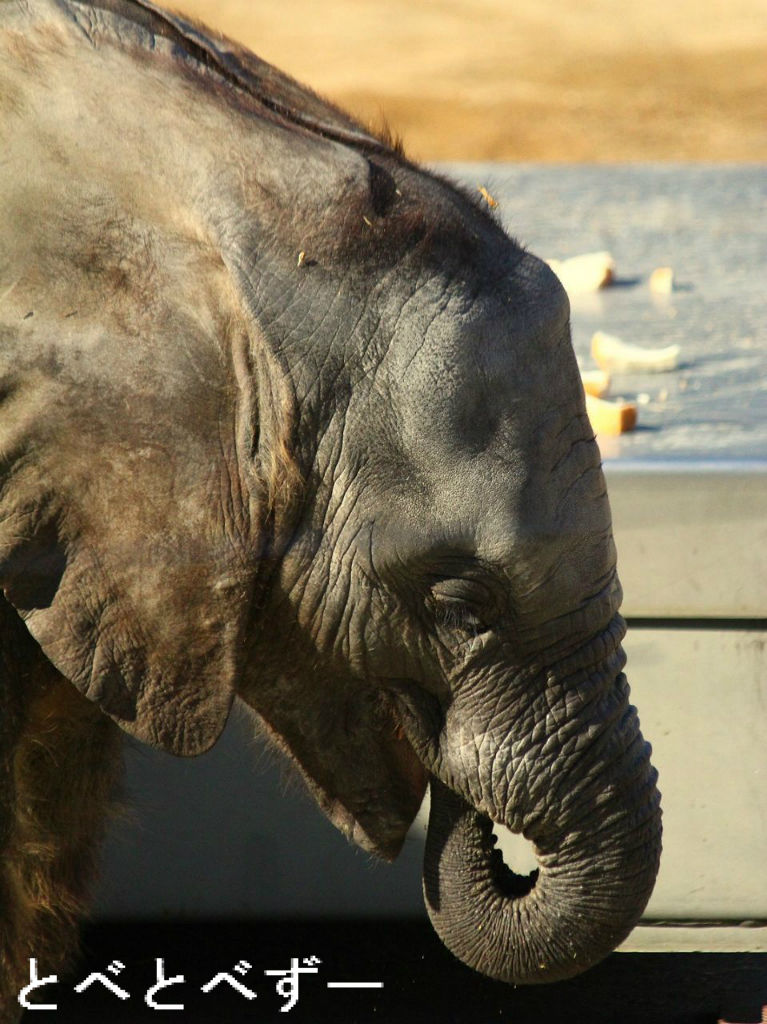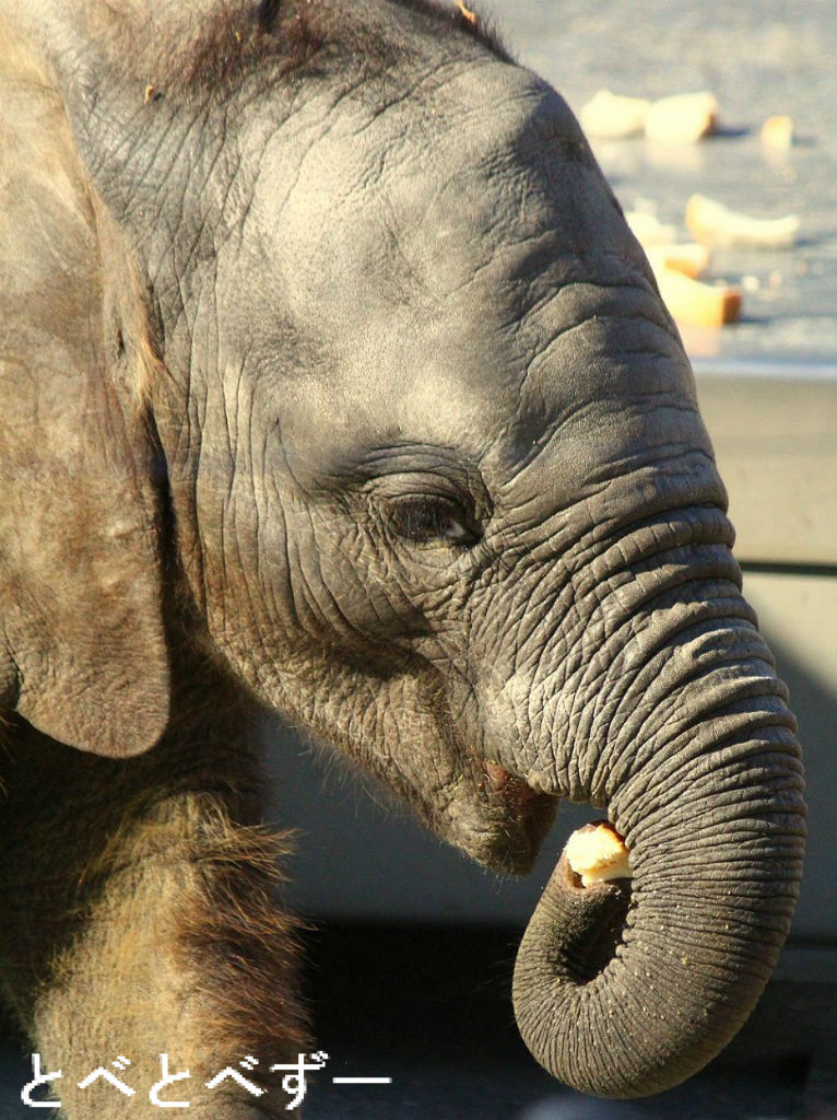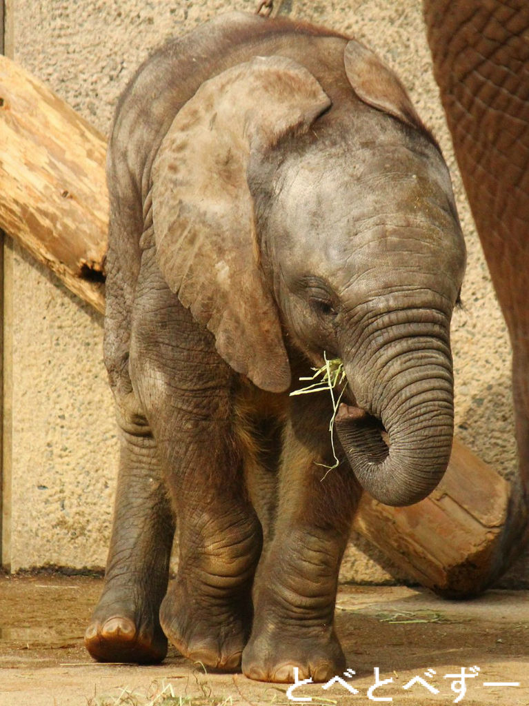 昨年の6月に生まれた赤ちゃんゾウの砥愛ちゃん。今もリカ母さんのおっぱいを飲んでいますが、最近ではお姉さんの媛ちゃん達と同じ物を少しづつ食べています。