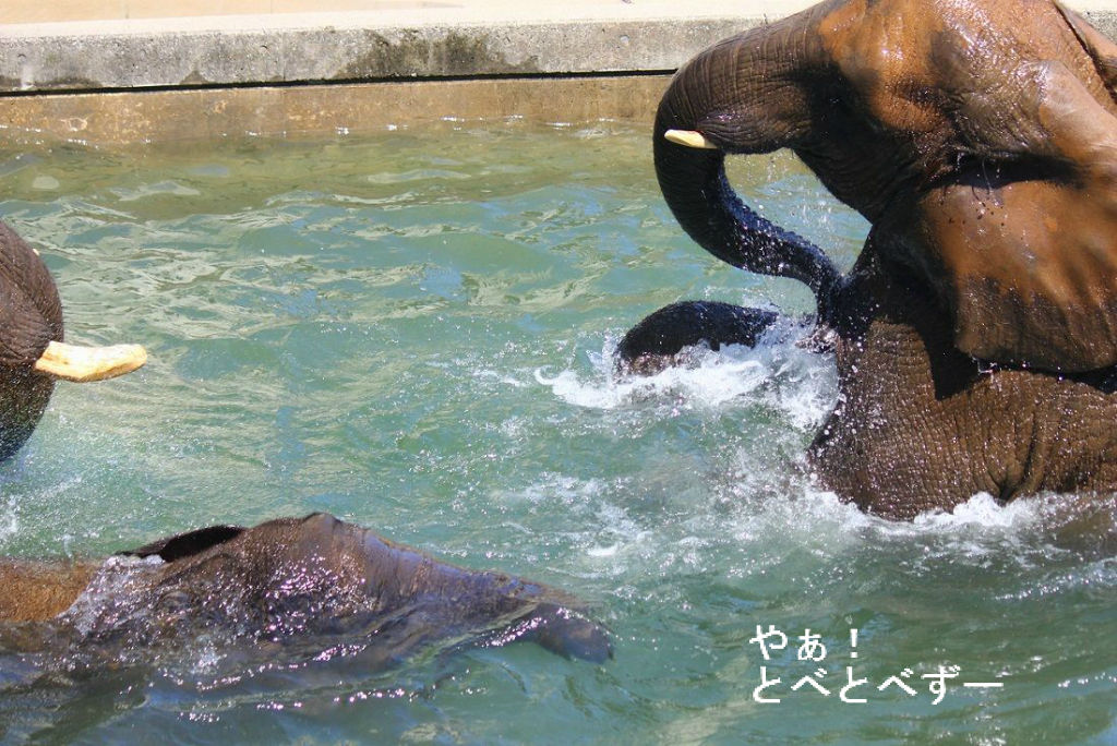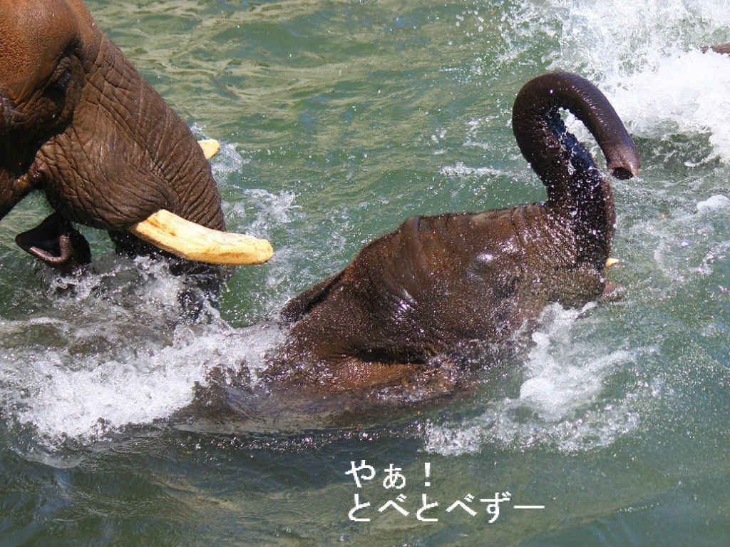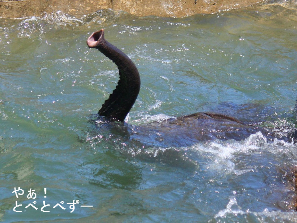 ゾウさんは鼻呼吸なので、こうやって鼻先を水面から出していると呼吸が出来るそうです。これまでは息を止めて潜っていたようだけど、鼻を出しての潜水泳法もマスターしたのかな?!