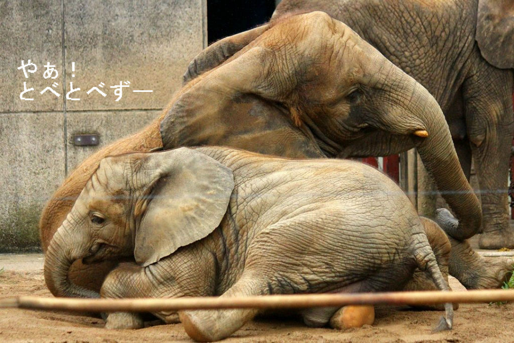前回に引き続き、砂場でゴロンゴロンするアフリカゾウの姉妹の様子です。