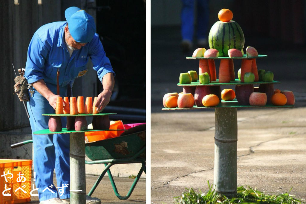 飼育員さんが野菜と果物で作ったクリスマスツリーを手作りされていました。お~、不安定な竹筒の上に、美味しそうなオヤツの3段ツリーが完成しましたよ(見事なバランスだ!)。しかも、とべ家の面々が大好きなスイカも載っているし!!(この時期もスイカがあるんですね)