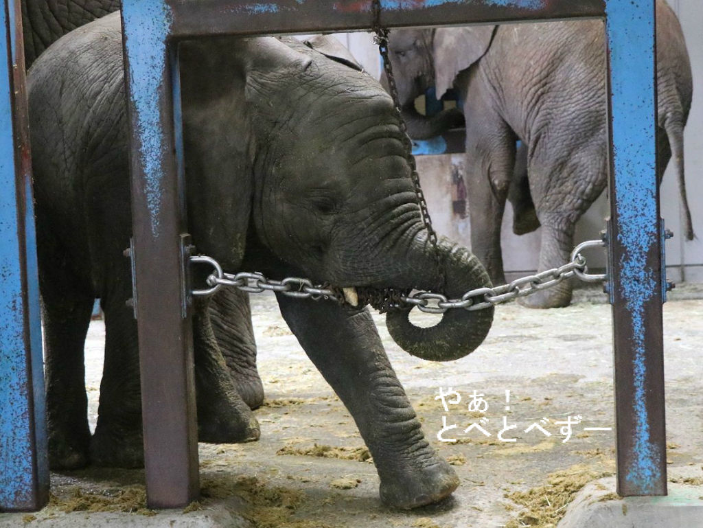 鎖を噛んだり、鼻で引っ張ったりして遊ぶ媛ちゃん。今日は外で遊べないもんね~。