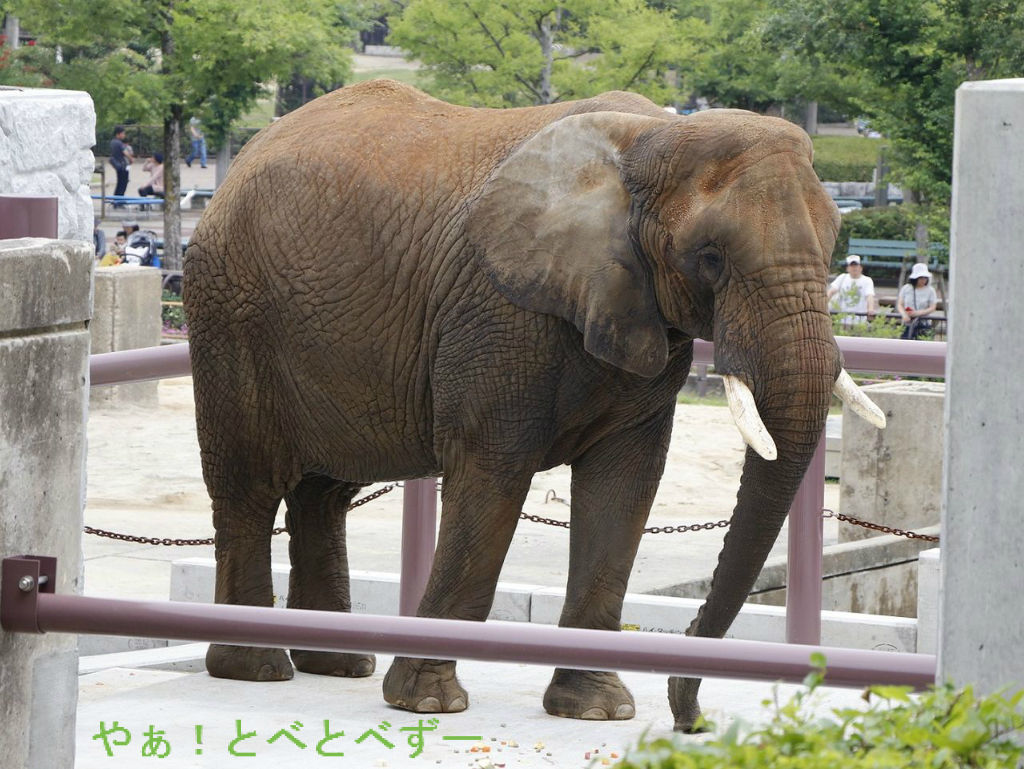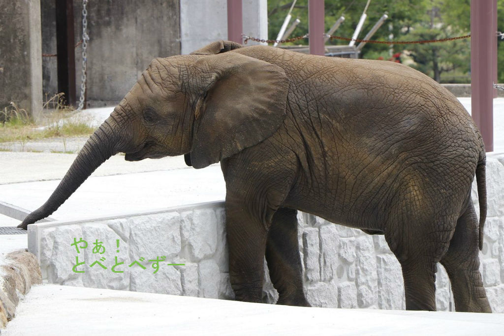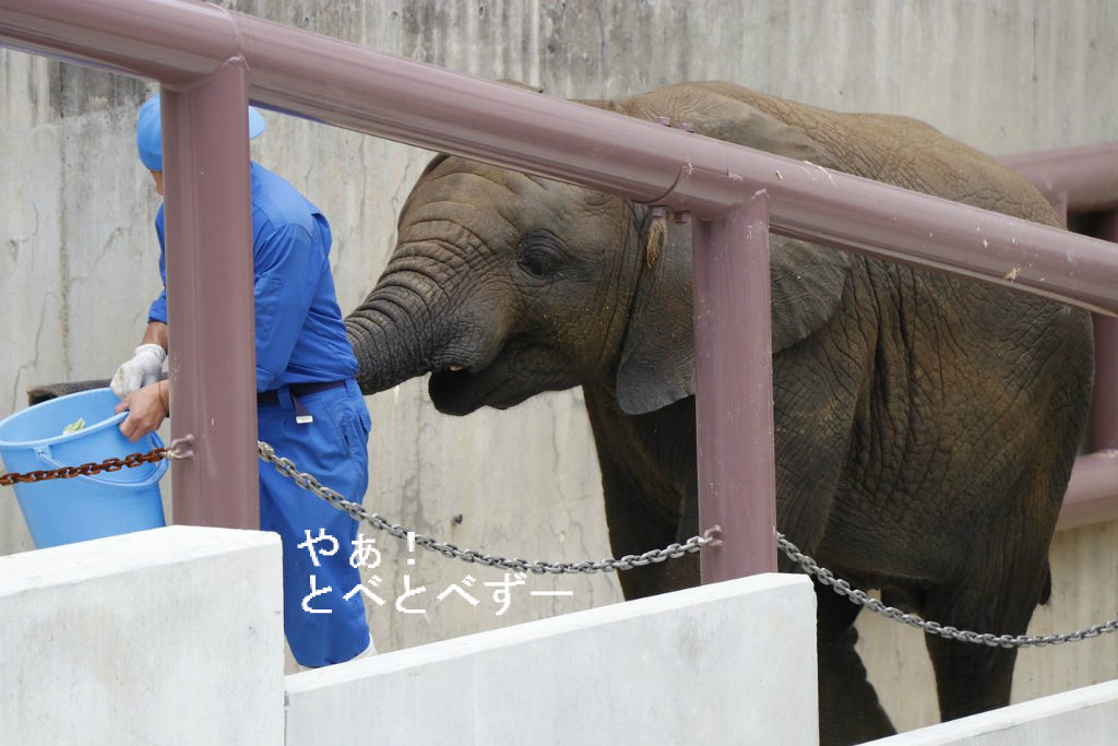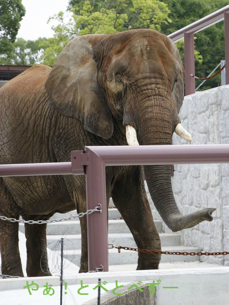 砥愛ちゃんの鼻が乗っている所が、インドゾウ運動場のある面です。この日はココまででしたが、もう今にもインドゾウ運動場へ飛びだしそうな雰囲気ですね。早く、運動場の奥にある触れ合いエリアで、砥愛ちゃん達にオヤツを手渡し、鼻渡ししたいな~。