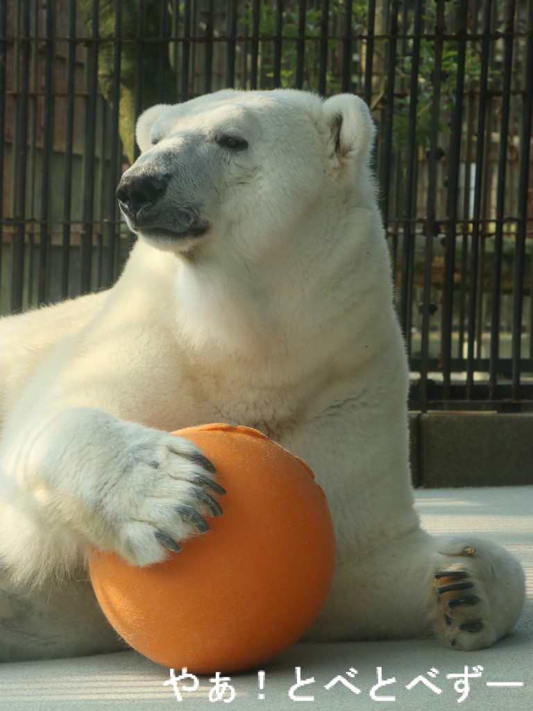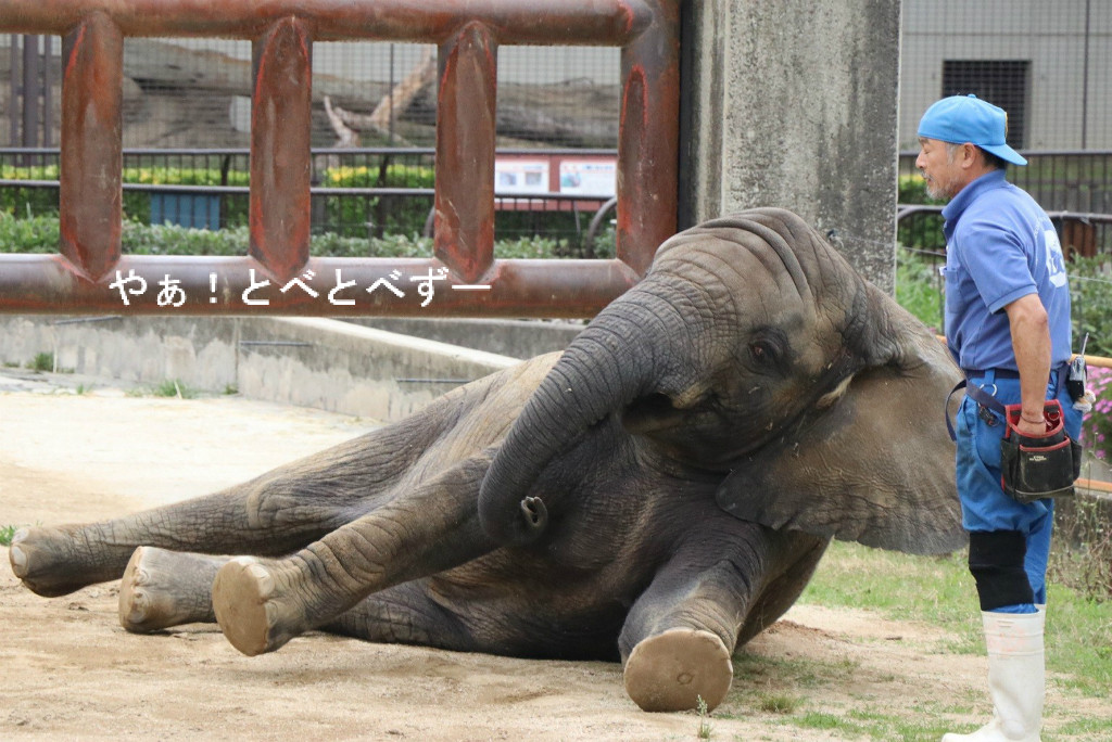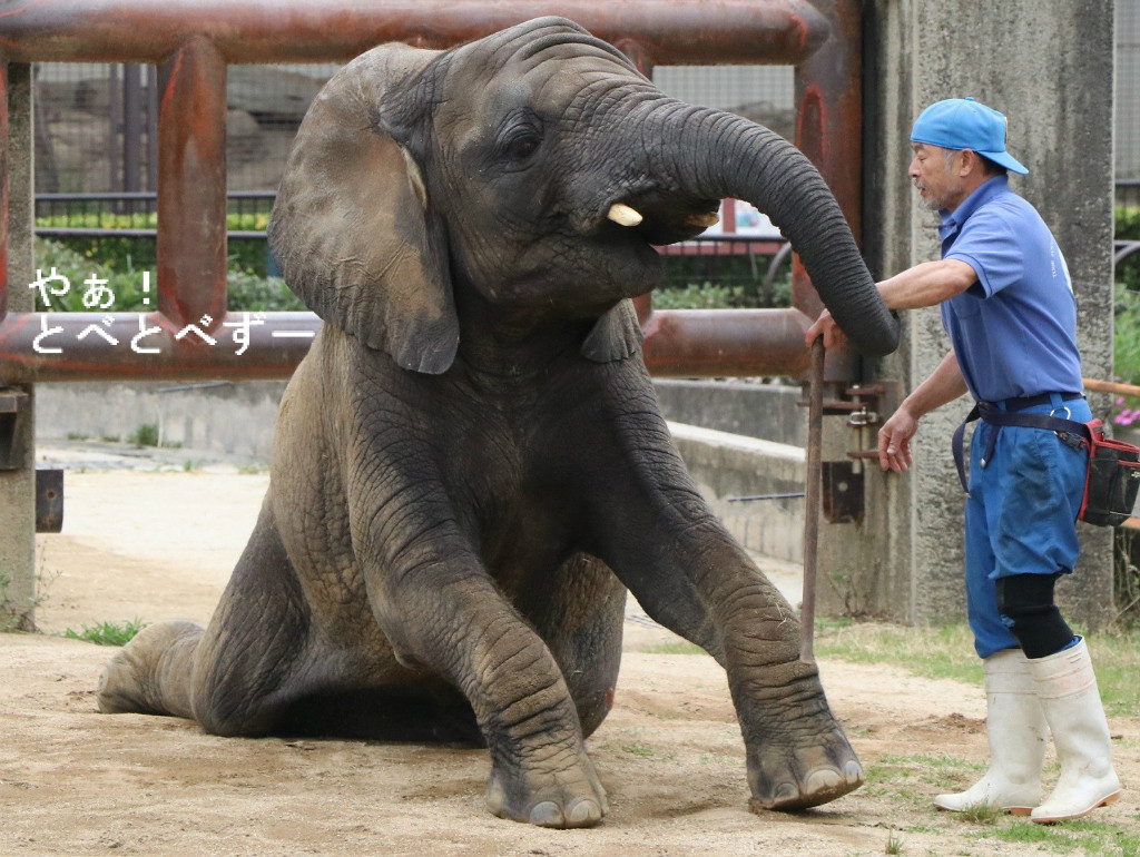 飼育員さんの指示により、前足を高く上げる砥愛ちゃん。これは鎖を足に繋ぐ、繋留する際や、足の裏などのお手入れをする際に重要です。とべ動物園のHPによると、砥愛ちゃん最近では前足と後足を同時に繋ぐ事も出来る様になったとの事です。偉いね~、砥愛ちゃん。
