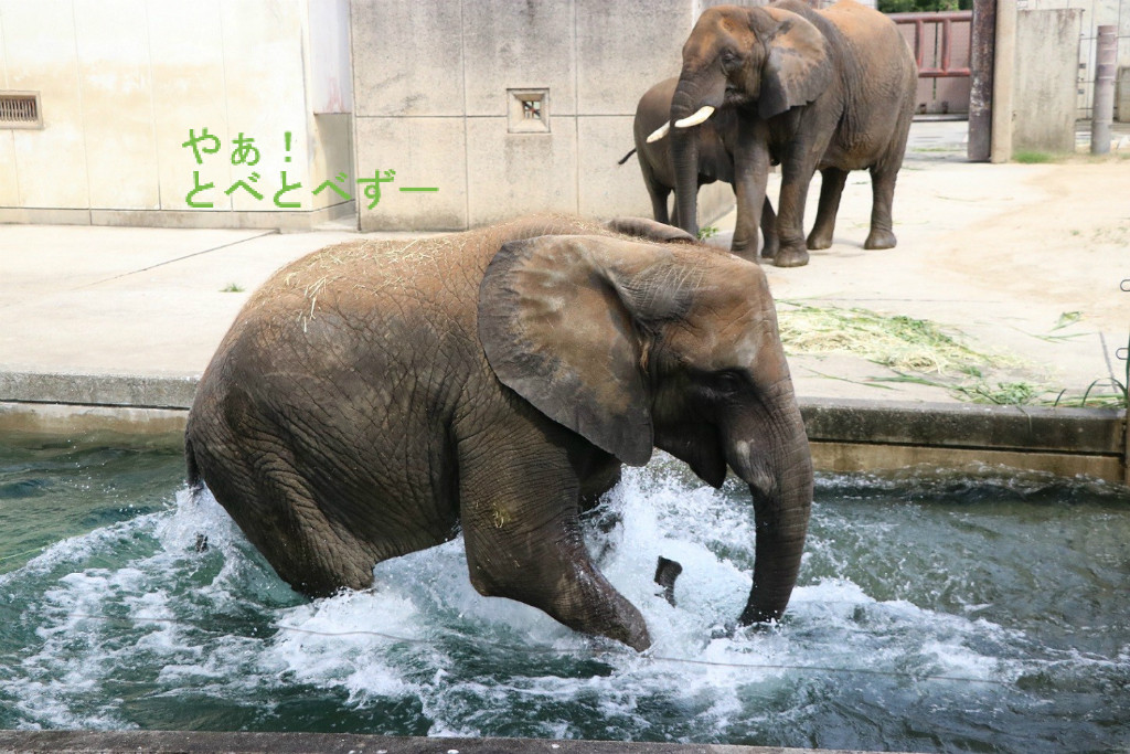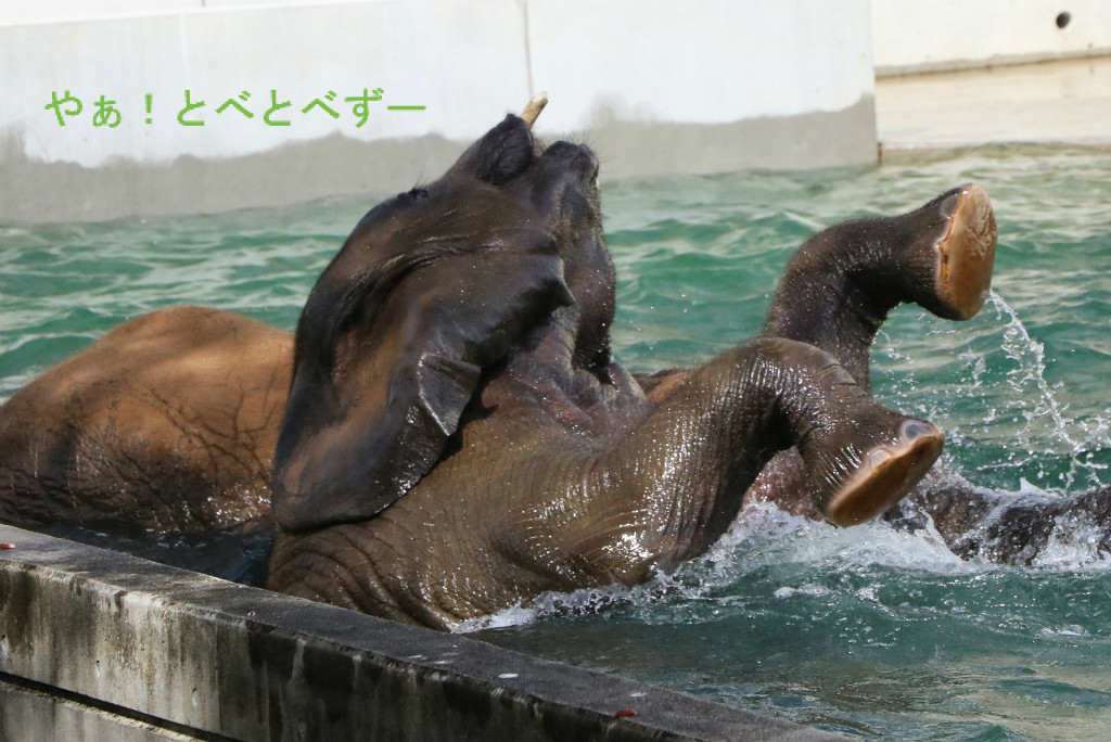 周りで見ていたお客さんも、「こんな姿、初めてみた!!」と大興奮していました。そうでしょう、そうでしょう♪ アフリカゾウがプールで遊ぶ姿を生で見られるなんて、貴重ですよ♪ 日本でも、とべ動物園だけかも!!