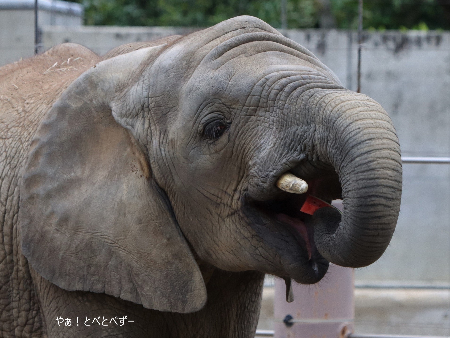 2か月ぶりのとべ動物園。とべ家の様子はというと、リカ母さんと砥愛ちゃんが鼻を上げての歓迎♪