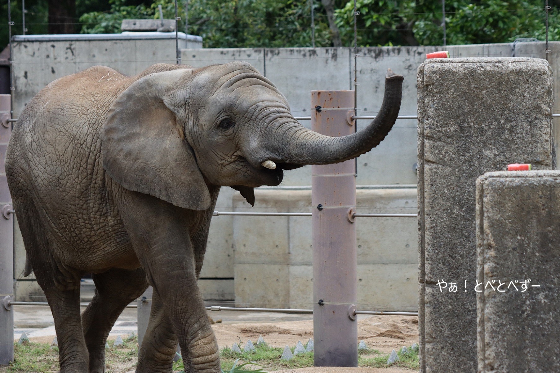 。ケさんの再開後の初出勤は再開後の初週末の6/5 (土) になりました。2か月ぶりのとべ動物園。とべ家の様子はというと、リカ母さんと砥愛ちゃんが鼻を上げての歓迎♪
