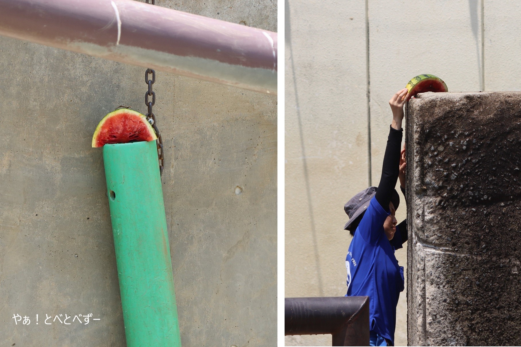 スイカは、とべ家のみんなの大好物。スイカとなると目の色が変わり、争奪戦が始まります。ですので、みんなが食べれる様にカットされたスイカが運動場のあちこちに置かれています。