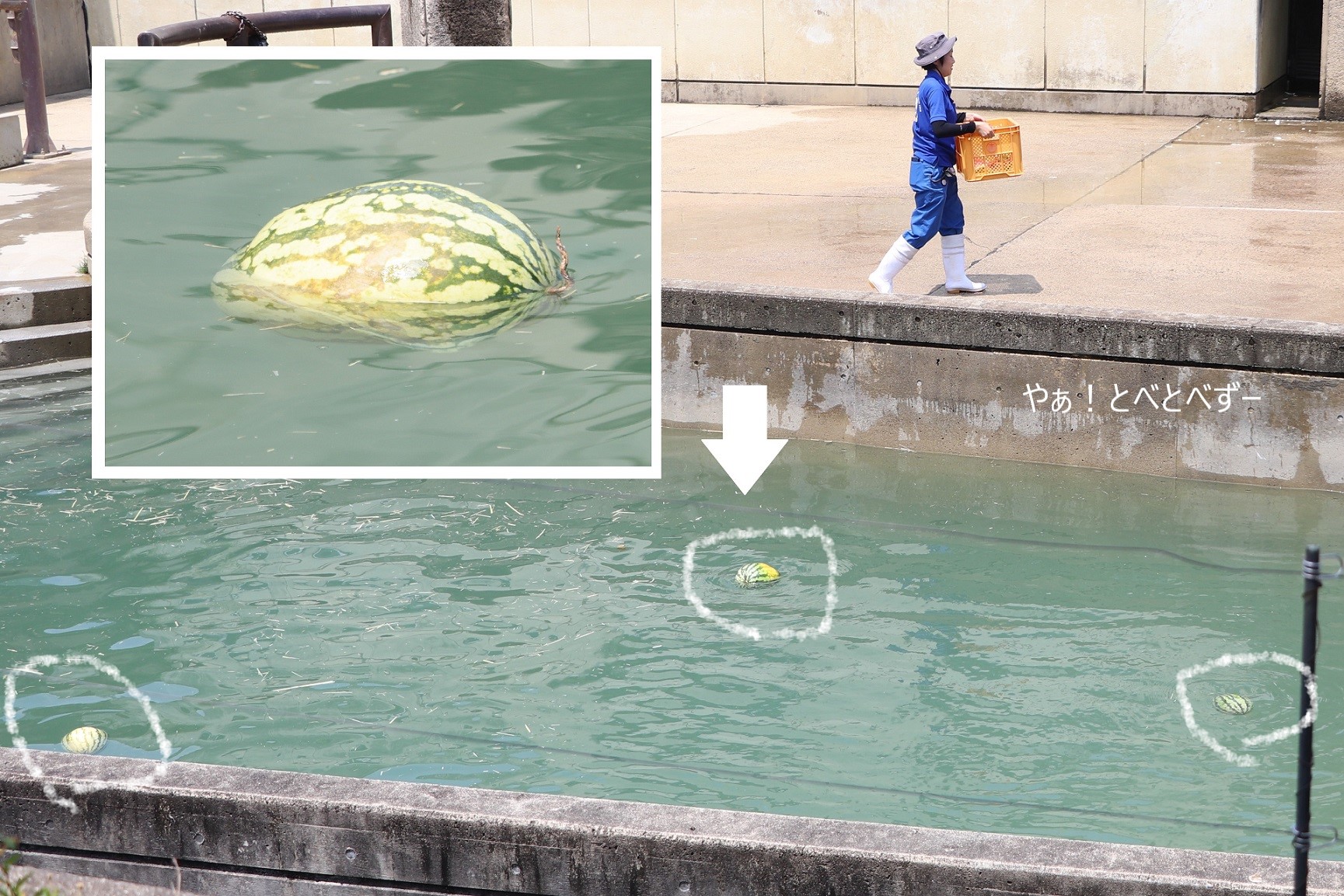 丸々スイカが3個、プールに投入されましたよ♪ 最近は先の理由から、まるまるスイカが出てくるシーンは中々見られないので、これは楽しみ♪ しかも丸々スイカとプールをダブルで楽しめる、抜群のイベント(←正式なイベントではないですよ。ご飯の時間の特別メニューです)じゃないですか♪