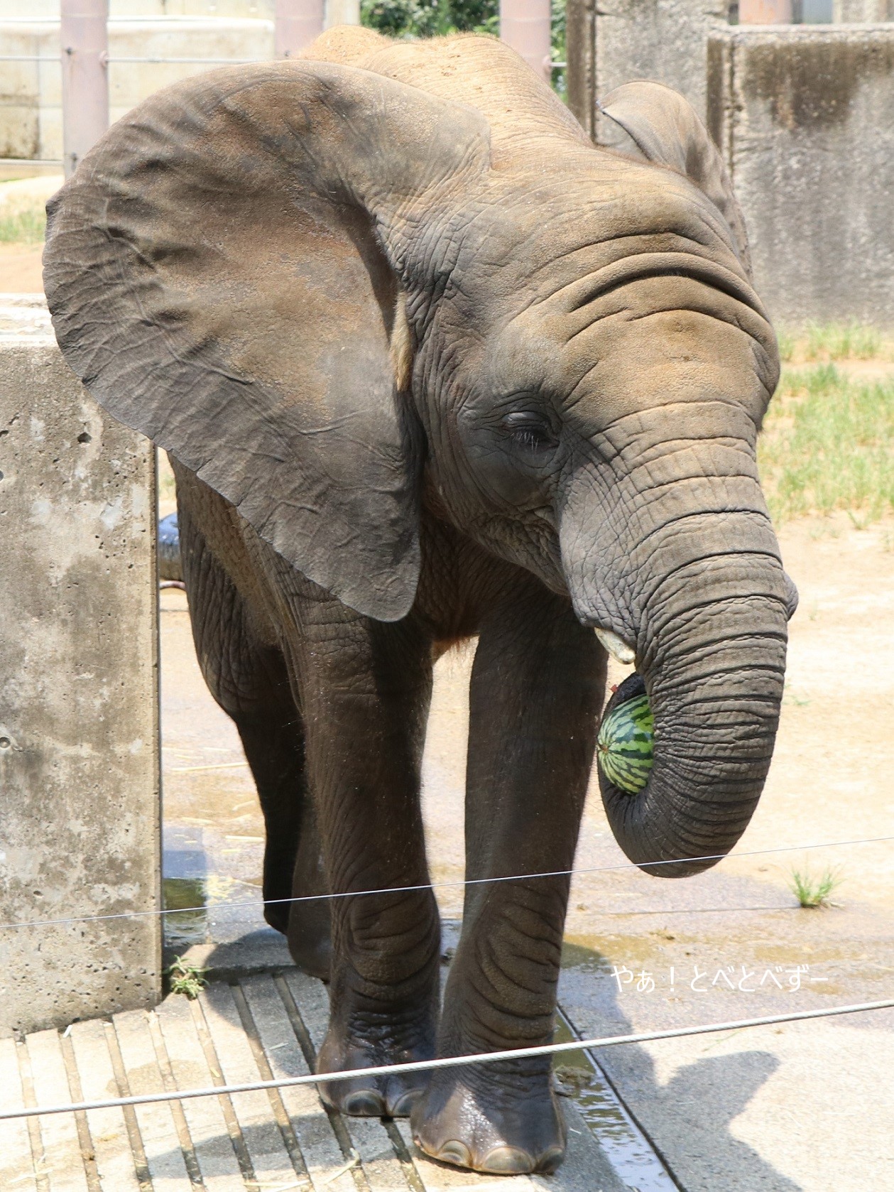 砥愛ちゃん、スイカを落とさない様に鼻先を口に咥え、大事そうにスイカを鼻で抱えています。