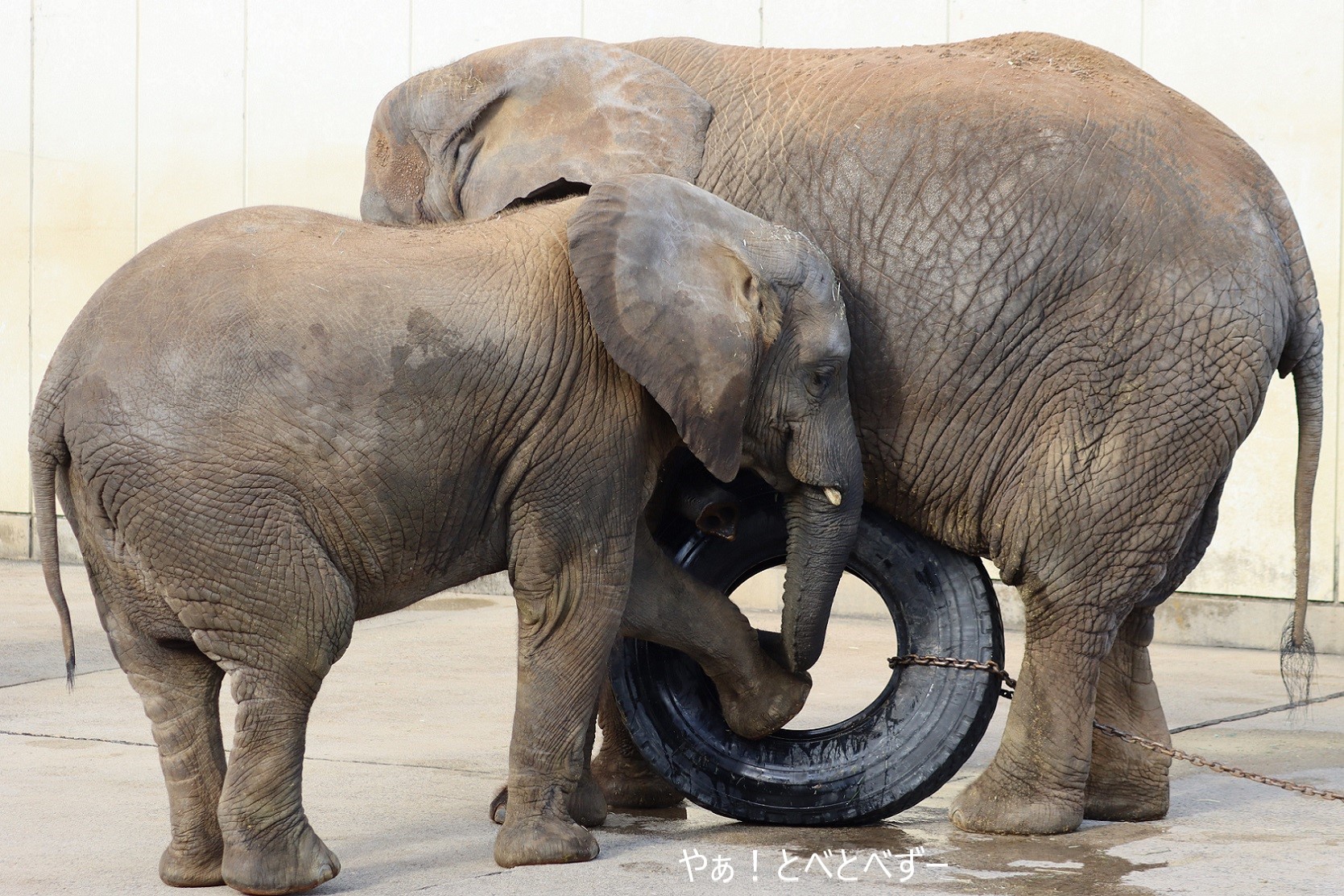 リカ母さん、軽々とタイヤを鼻と前脚で起こして・・・