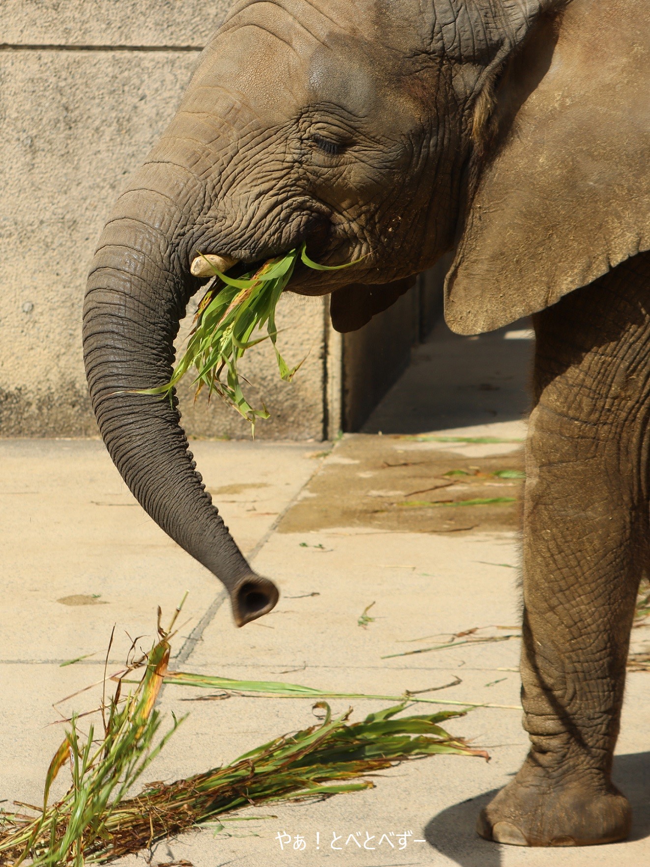 青々とした葉っぱの方を食べ、茎の方は鼻で掴んで・・・