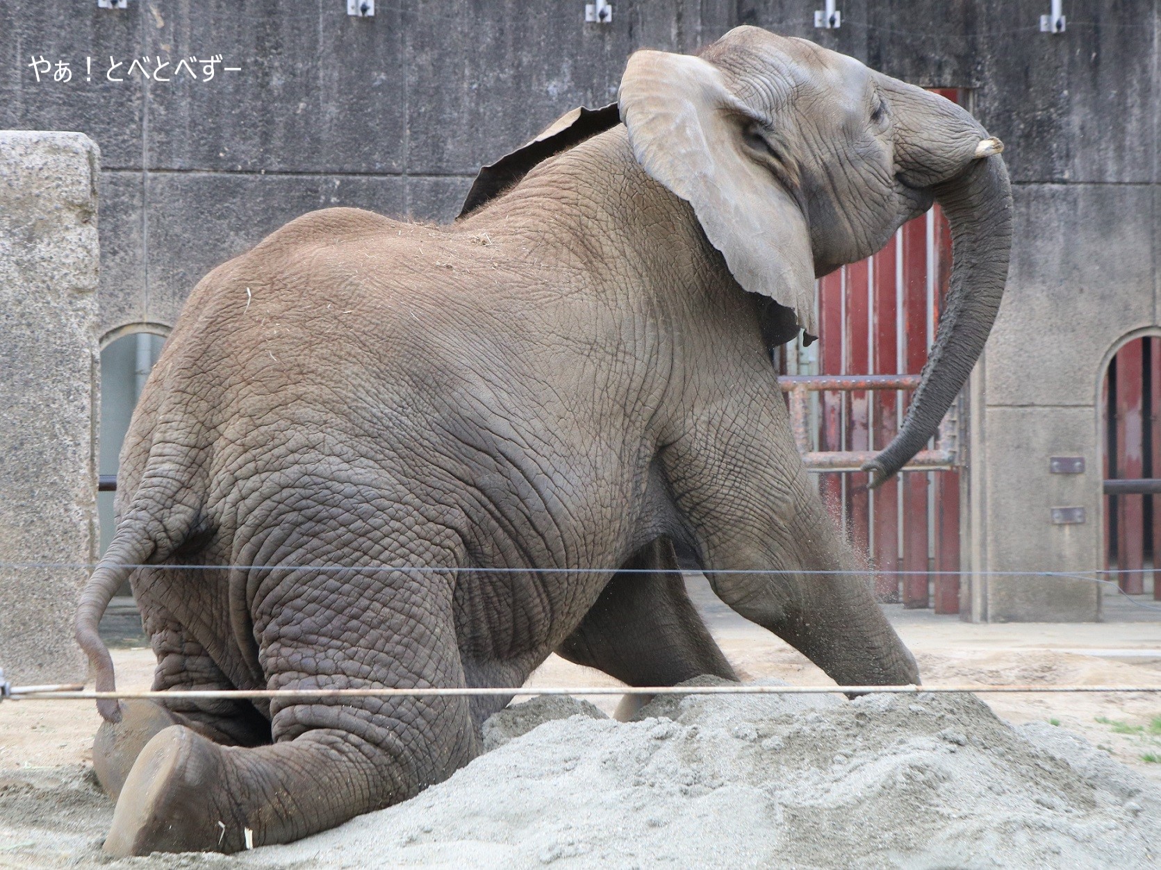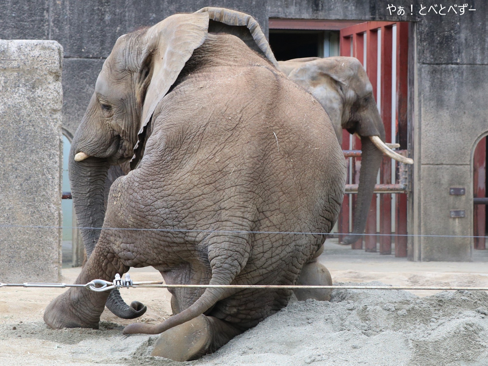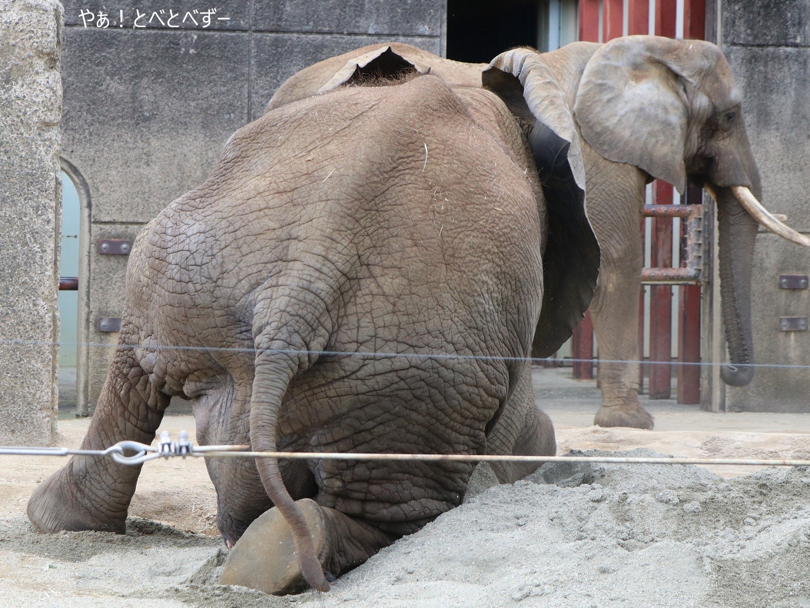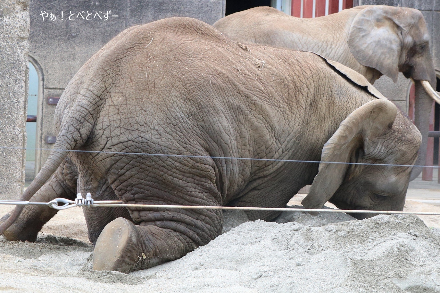 運動場には定期的に新しい土や砂が搬入されるのですが、直ぐに踏み固められてしまい(体重が重いですからね)固くなってしまいます。そうなっても肢で土を掘り起こしたりして砂浴びをするのですが、ゴロンゴロンするのはやはりサラサラの時が多い感じです。こんな楽しい様子を見ていると、家庭用の耕運機で時々掘り起こしてあげたいな~なんて思ってしまいます。
