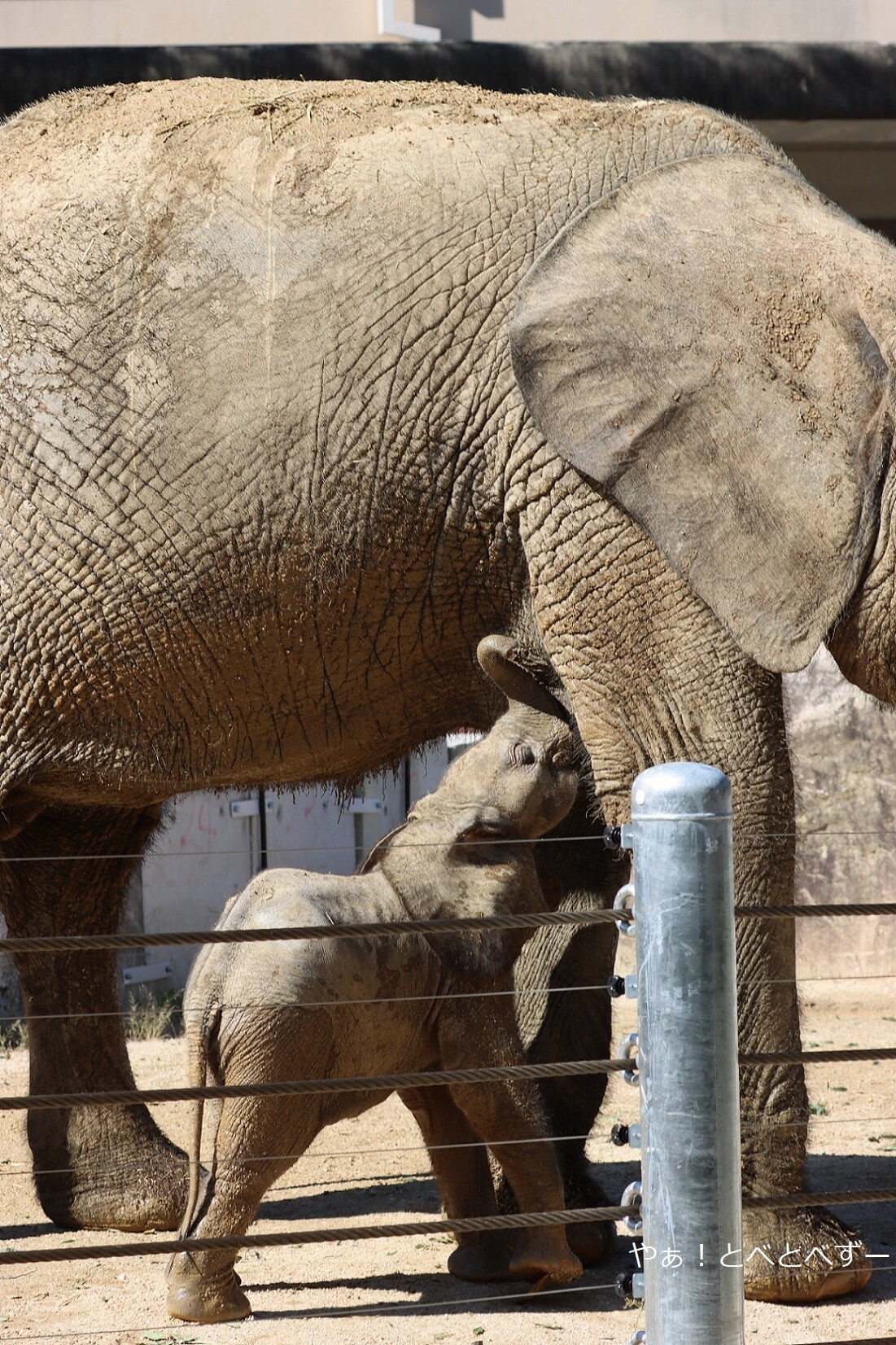 こうやって並んでいると、マルミミゾウの赤ちゃん小さいですよね~。マルミミゾウはアフリカゾウ(サバンナゾウ)と比べて小さいとの事ですが、とべ家の媛ちゃん(姉)、砥愛ちゃん(妹)と比べてどうかな~と思って調べてみると、メイちゃんの体高(肩までの高さ)が240 cm との事なので・・・